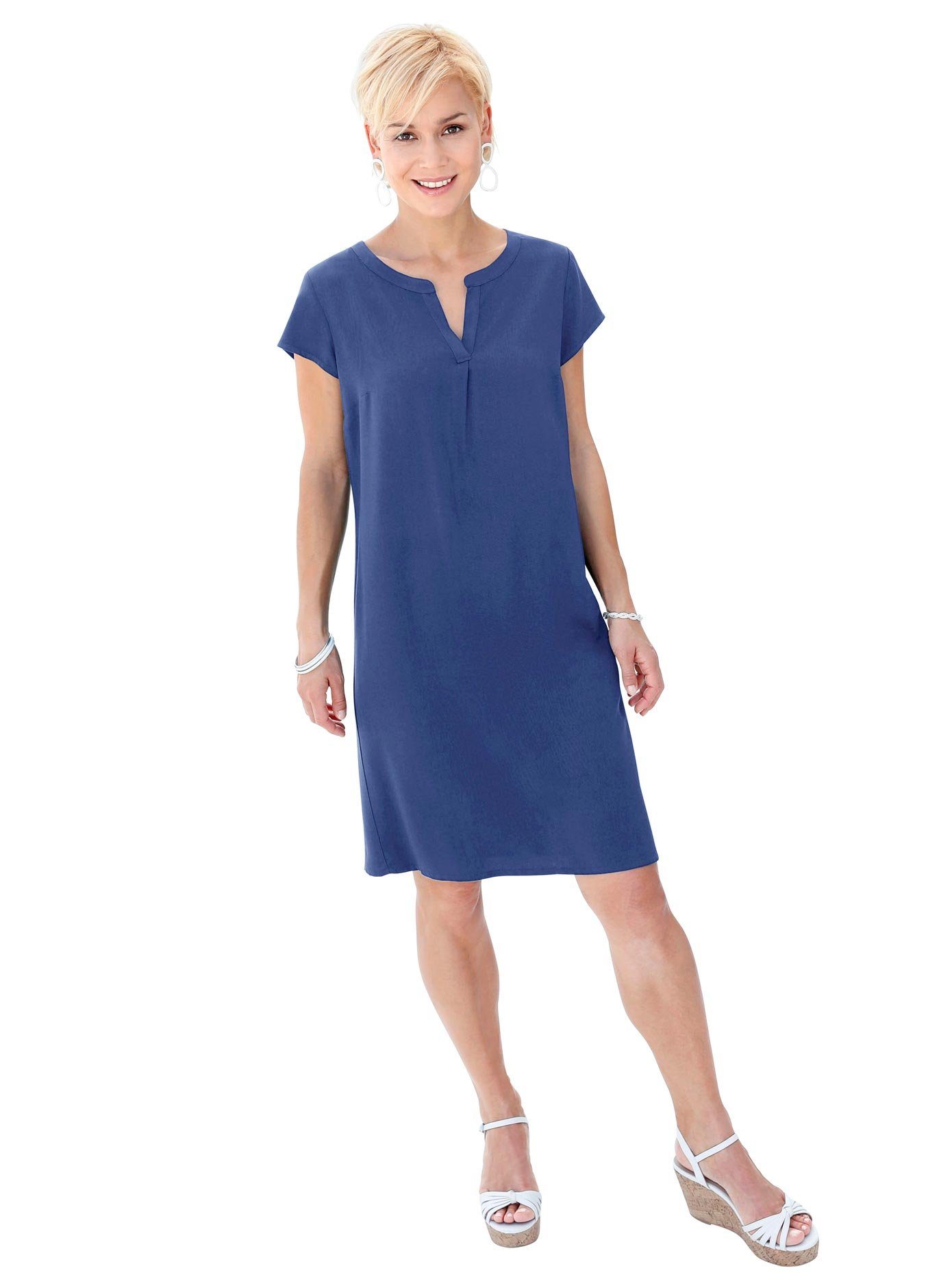 Zomers lichte jurk met flatteuze figuurnaden voor. De gladde, zware viscosekwaliteit valt zeer prettig en is ook nog eens bijzonder gemakkelijk in onderhoud! Ronde hals met kleine V-uitsparing. N-maten: lengte in mt. 42 ca. 100 cm. K-maten: lengte in mt. 21 ca. 94 cm. 100% viscose. Machinewas.