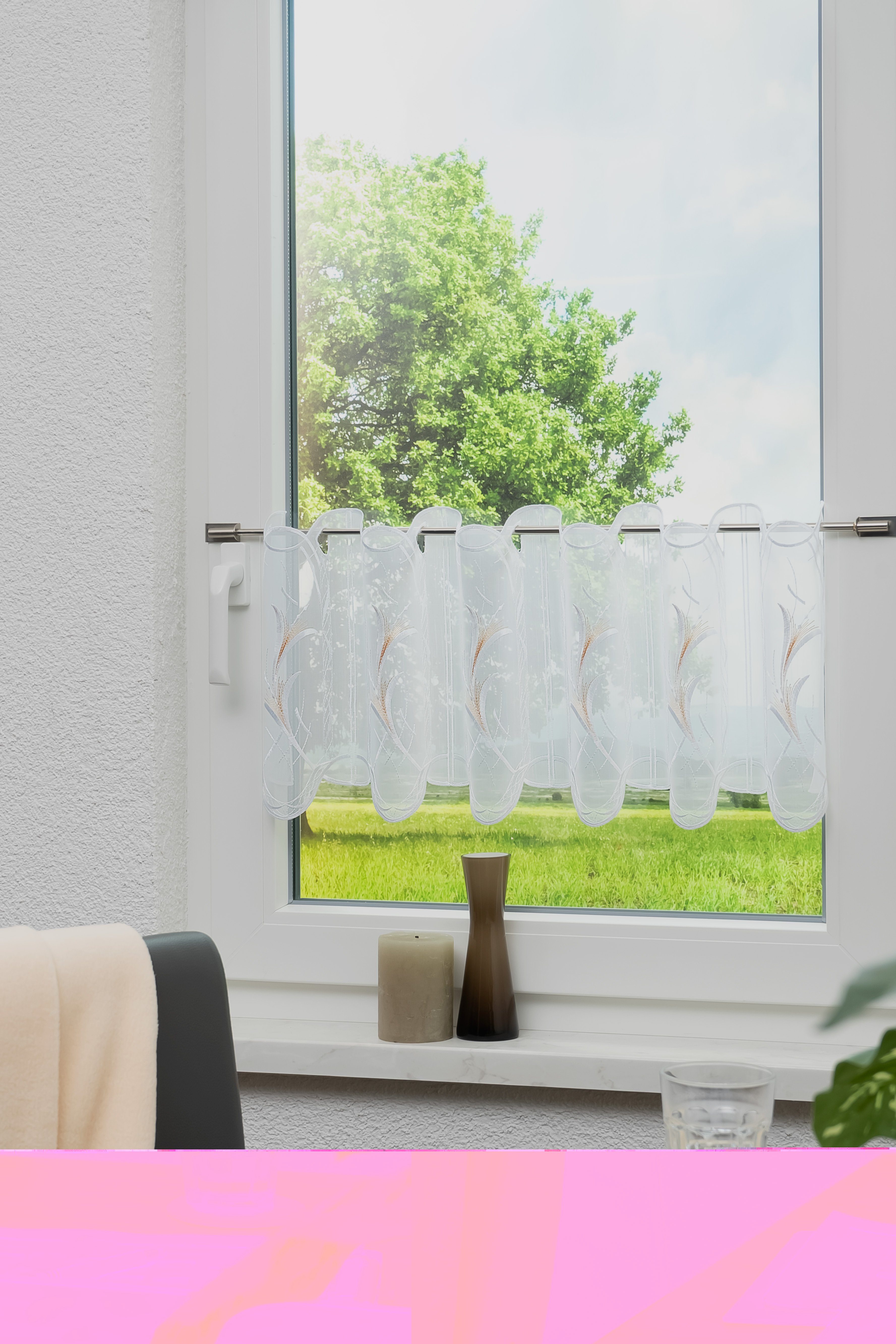 Let op decoratie | Kant-en-klaar aan het raam bevestigd, is de breedte ca. de helft minder. |
