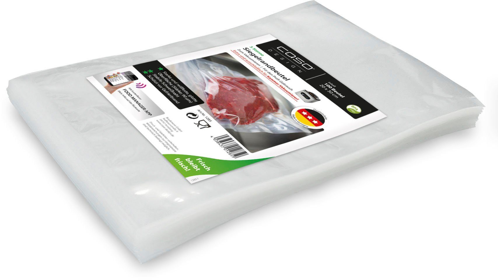 Overige voordelen | CASO vacuümzakken zijn sterk & scheurvast (materiaalsterkte: 90 µm). Bijzonder geschikt voor opslag in koel- en vrieskast (optimale bescherming tegen vriesbrand) | Vlakke oppervlakte, stabiele lasnaad | Uitstekend geschikt voor sous-vide koken (tot 70°C voor max. 2 uur) | Herbruikbaar, voedselveilig | Vacuüm verpakte voedingsmiddelen blijven tot 8x langer vers. |