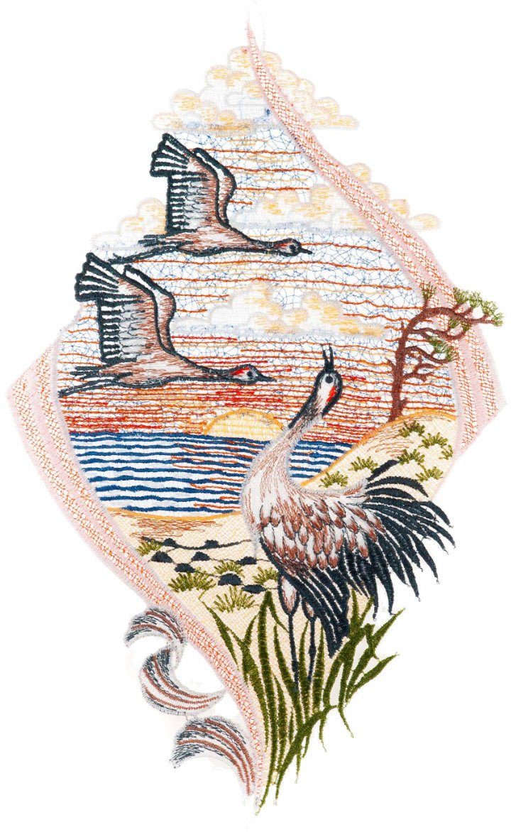 W. Reuter & Sohn - Plauener Spitze® Raamdecoratie "kraanvogels" in kleur