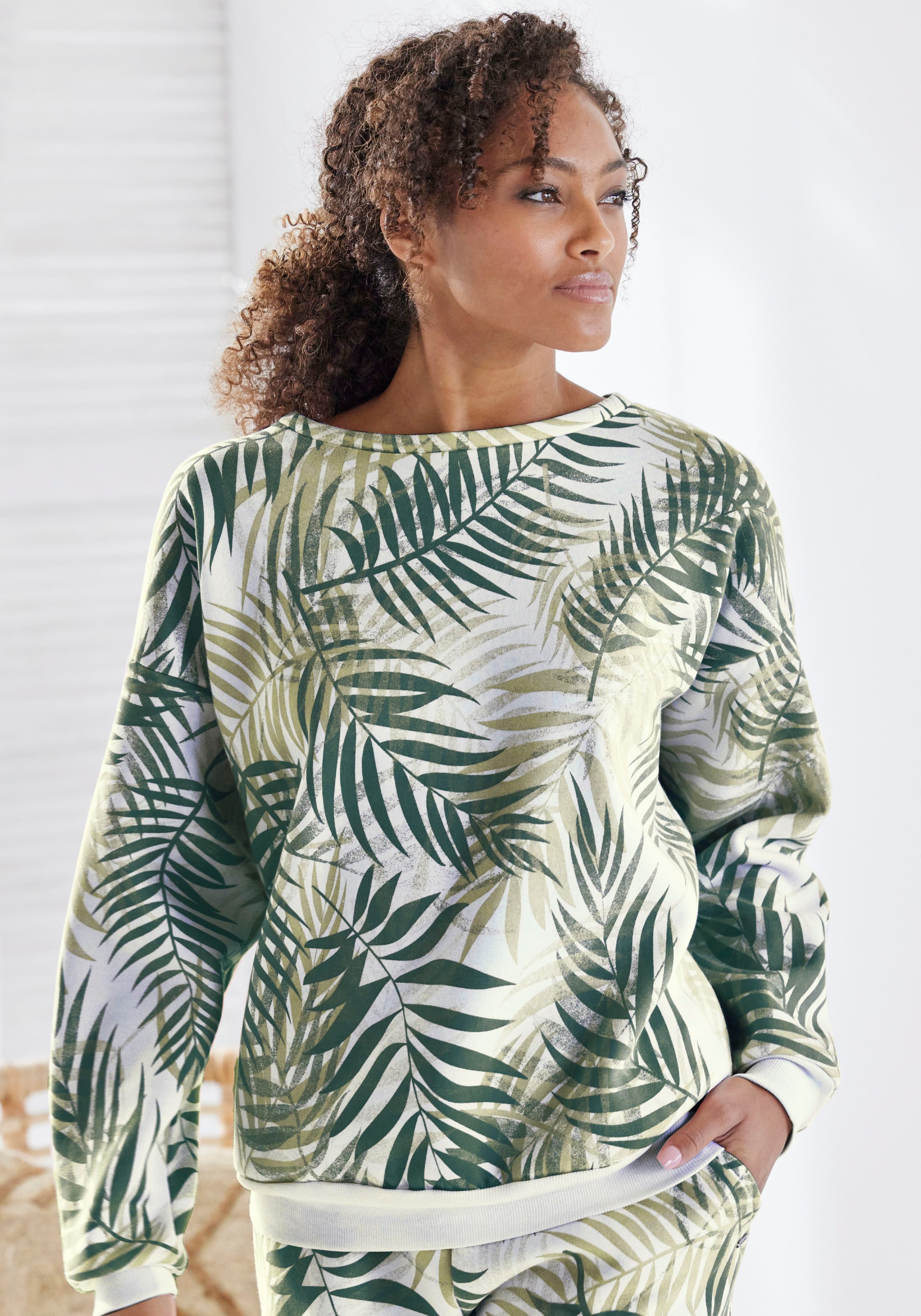 Lascana Sweater Loungeshirt Loungetop met allover-bladerenprint, loungewear (1-delig)