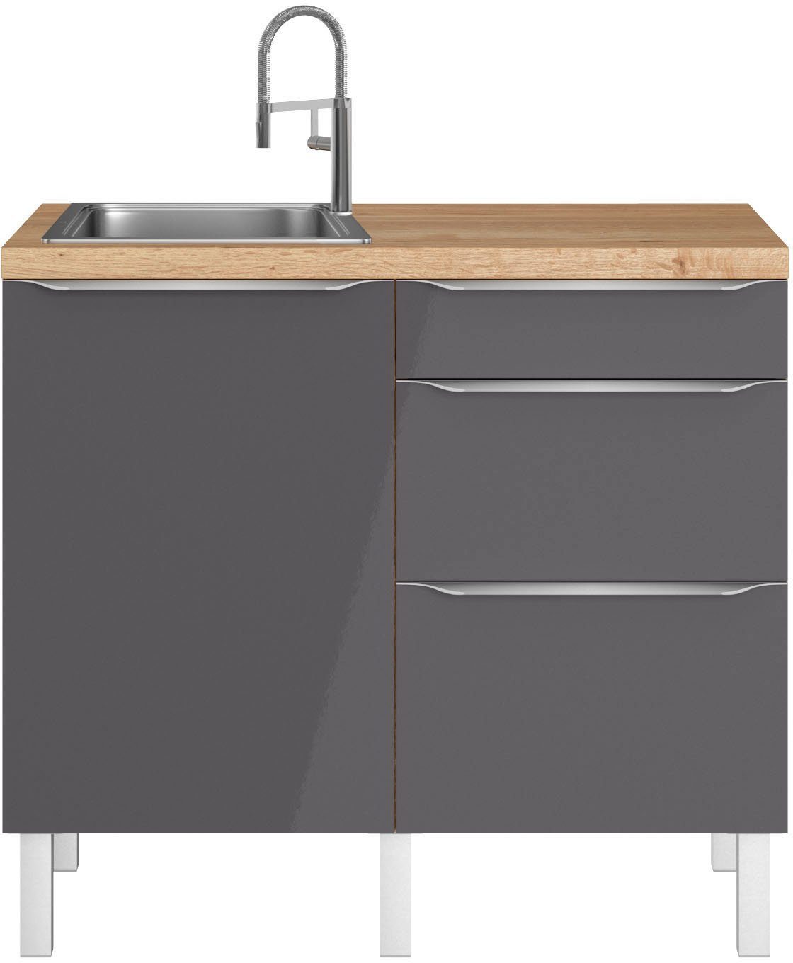 Uitvoering | Zonder elektrische apparaten | doorlopende werkblad | inclusief roestvrijstalen inbouwspoelbak, met afdruipgedeelte | greeplijst | stabiele metalen uitschuifladen | deuren naar keuze rechts/links monteerbaar | in hoogte verstelbare poten | omgekeerd plaatsbaar |