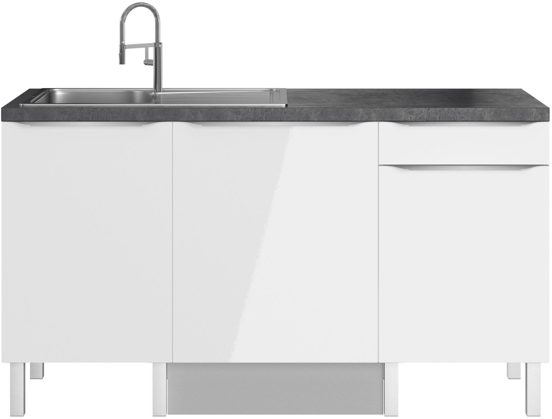 Uitvoering | Zonder elektrische apparaten | doorlopende werkblad | inclusief roestvrijstalen inbouwspoelbak, met afdruipgedeelte | greeplijst | stabiele metalen uitschuifladen | inlegplanken in hoogte verstelbaar | deuren naar keuze rechts/links monteerbaar | in hoogte verstelbare poten | omgekeerd plaatsbaar |