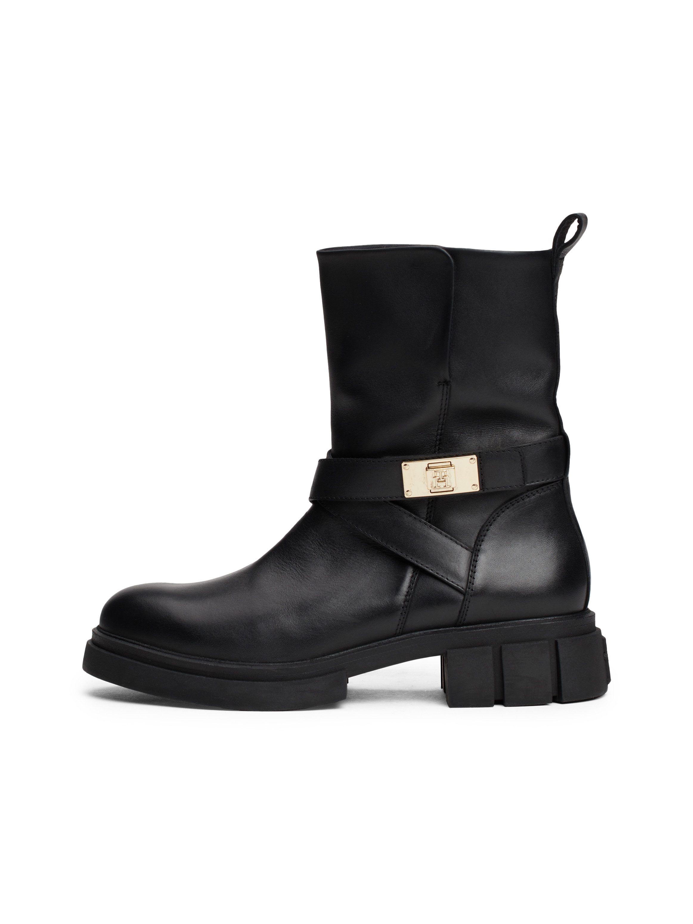 Tommy Hilfiger Bikerboots BIKER LEATHER blokhak, enkellaars, laarzen met goudkleurige sieraad