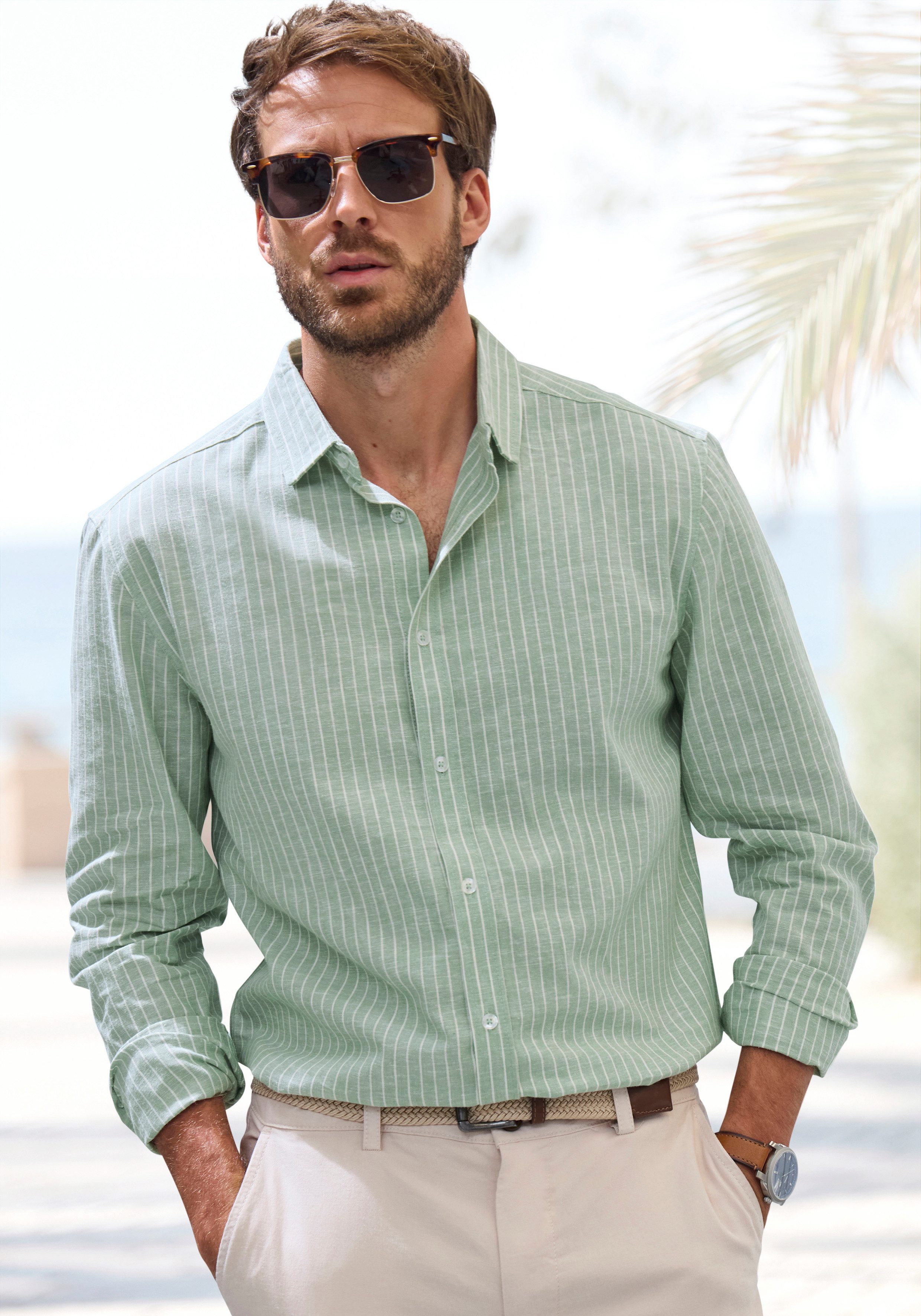 John Devin Overhemd met lange mouwen In linnen look, Gestreept overhemd van puur katoen, regular-fit