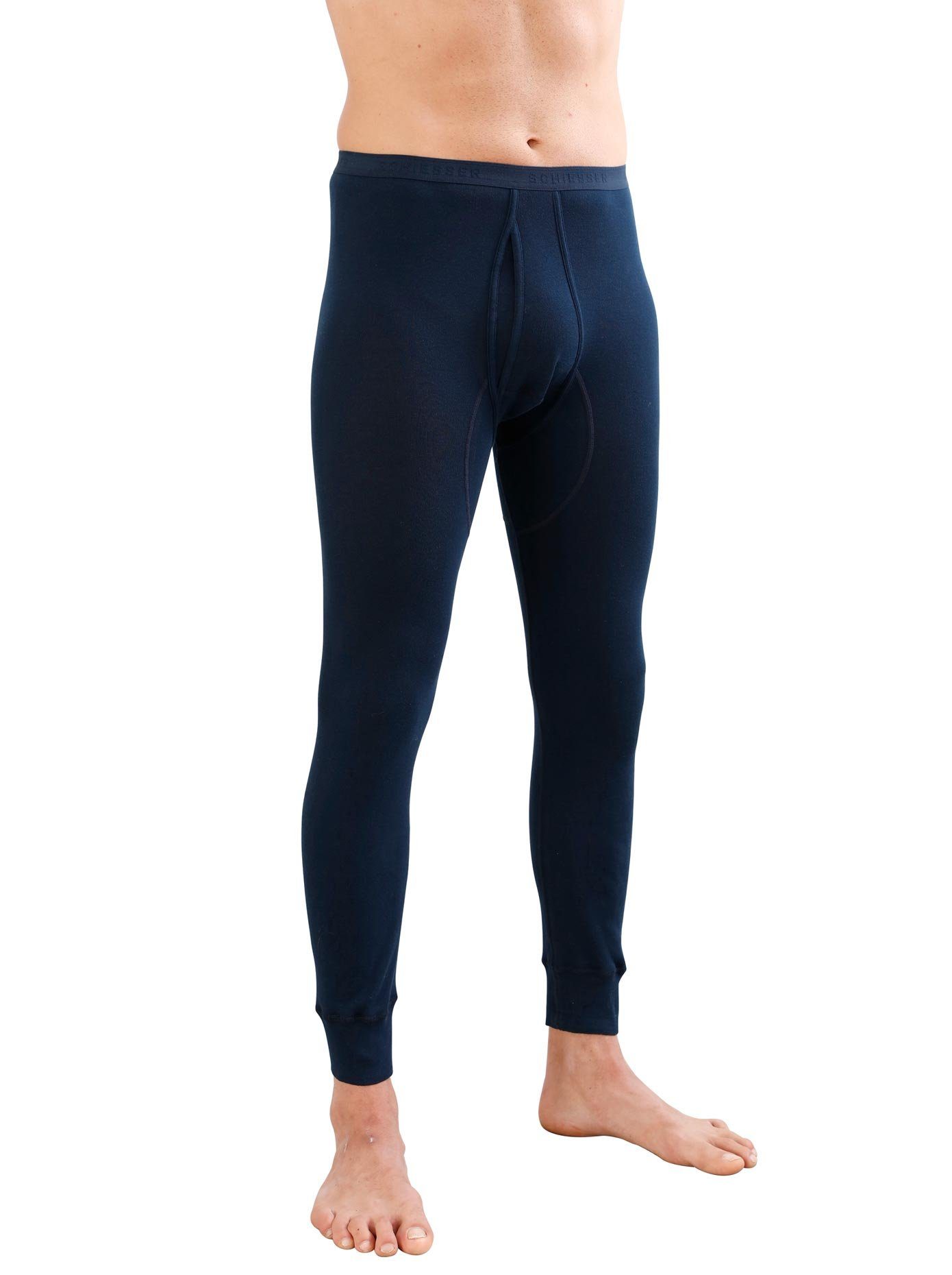 Lange onderbroek, Schiesser. In twee verschillende lengten. Dubbelrib: katoen in excellente mako-kwaliteit. Tweedradig, supergekamd. Met gulp en dubbel verwerkte, zachte elastische band. Kookwasbestendig tot 95.