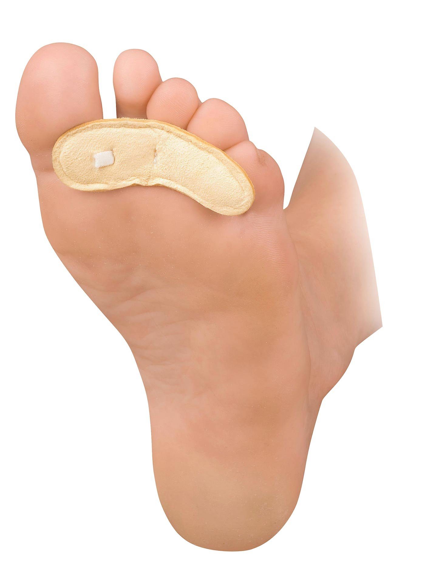 Hamerteencorrectie. Voorzien van met leer overtrokken, elastische band en kussentjes - corrigeren op zachte wijze! Gevormd voor de linker- en rechtertenen. 50% latex, 50% leer.
