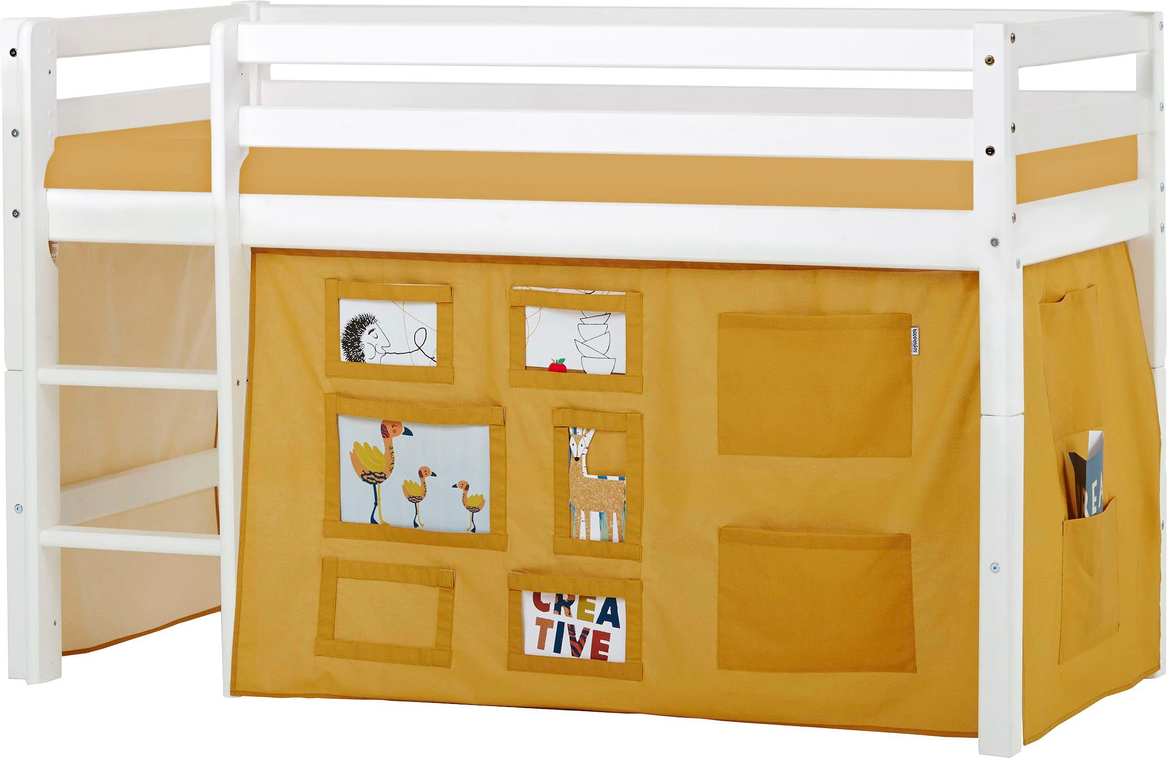 Informatie leveringssamenstelling | U ontvangt: 1 kinderbed met module voor halfhoog bed, 1 gordijnset |