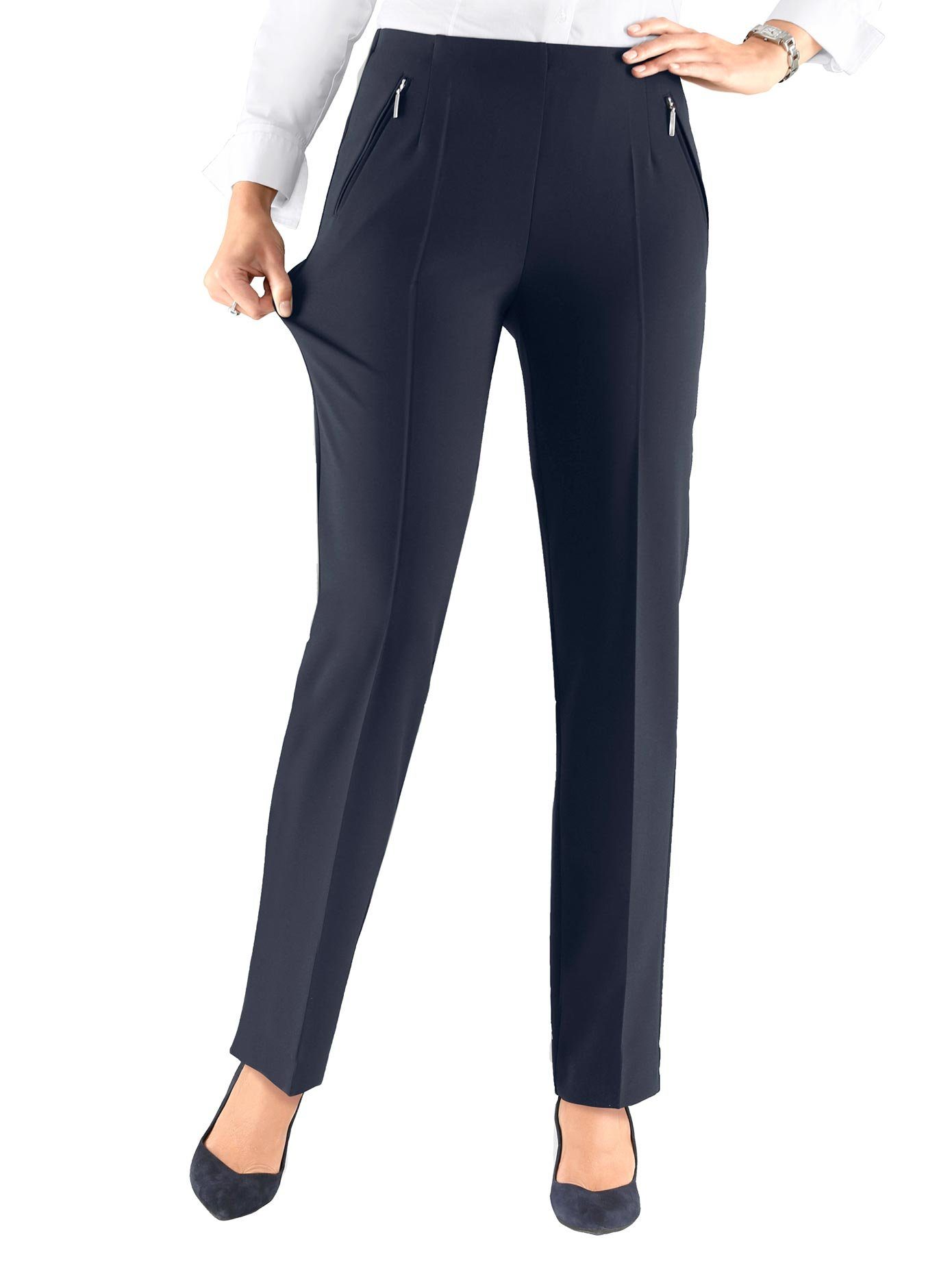 Maximaal draagcomfort: heerlijk zachte broek van Adelina in bewegingselastische, vormvaste Magic-stretchkwaliteit. Rondom elastische band, voor glad verwerkt. Ritszakken opzij met zilverkleurige rits. Stijlvolle persplooien. Ook ideaal op reis. N-maten: binnenbeenlengte ca. 77 cm. K-maten: binnenbeenlengte ca. 72 cm. 88% polyester, 12% Elastan. Machinewas.