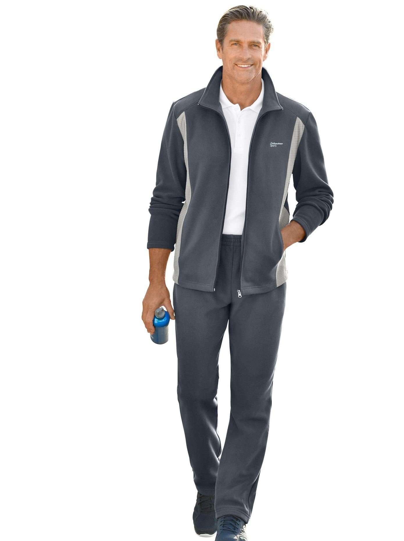 Vrijetijdspak van weldadig warme, heerlijk zachte fleece – ideaal om in te relaxen. Jas met staande kraag, deelbare ritssluiting en 2 zakken opzij. Mooie contrastkleurige structuurinzetten opzij. Broek met elastiek en 2 zakken opzij. 100% polyester. Machinewas.